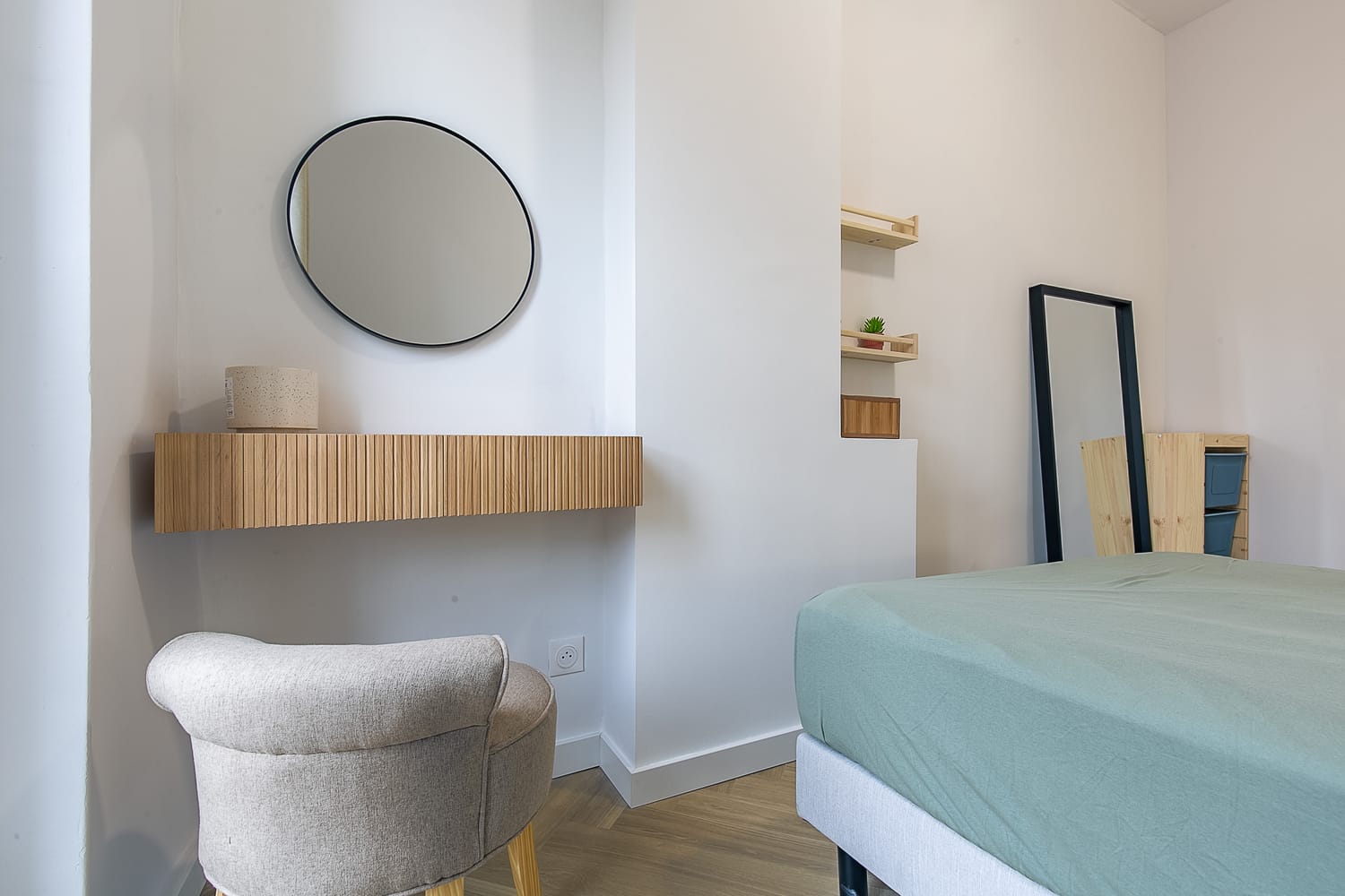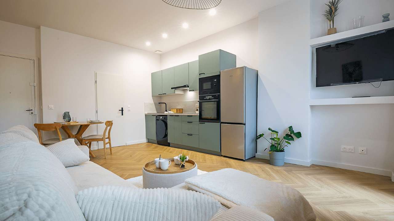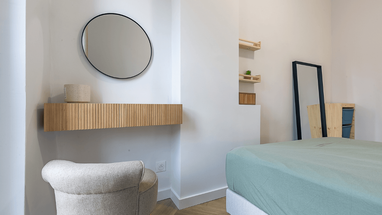 Le projet a nécessité un véritable travail d’architecture intérieure afin de transformer ce 44 m² en un appartement plus cohérent, plus fonctionnel et plus adapté à la demande locative du secteur.