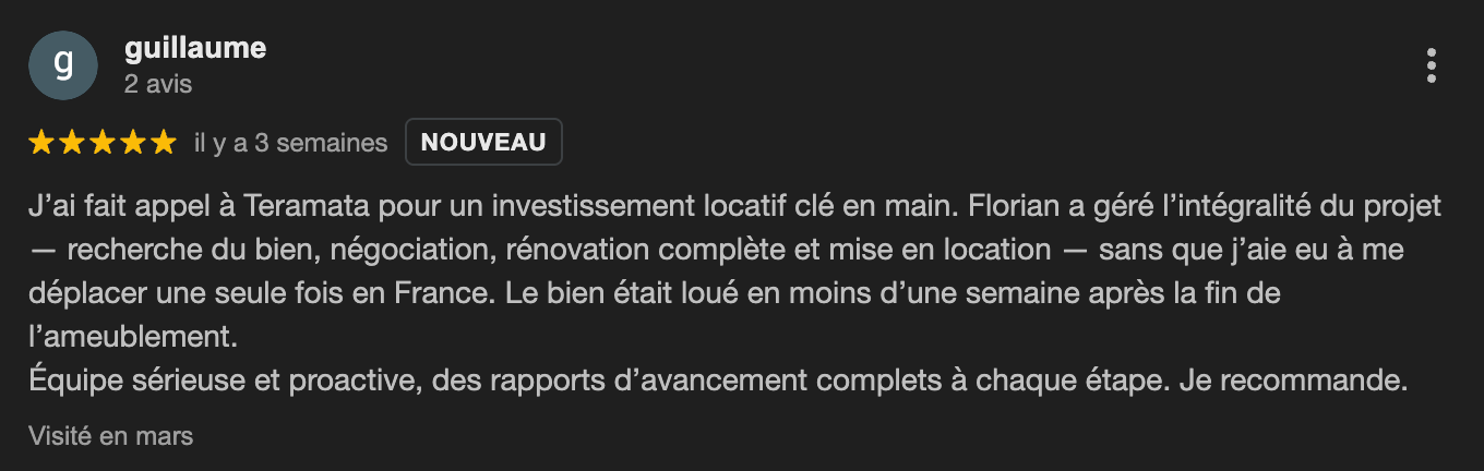 Guillaume est aujourd’hui très satisfait de cet investissement, et nous réfléchissons déjà ensemble à un troisième projet immobilier.